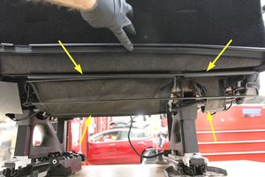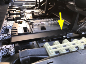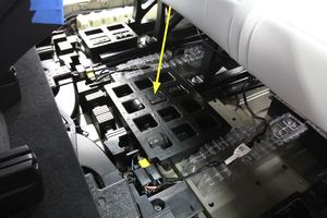 NoteLift front of panel up to release clips, While lifting up, need to release the rear sliding plates from the seat and slide them all the way back, Once free, lift rear of panel and slide out from behind seats, Use caution since floor panel can damage HVAC ducts