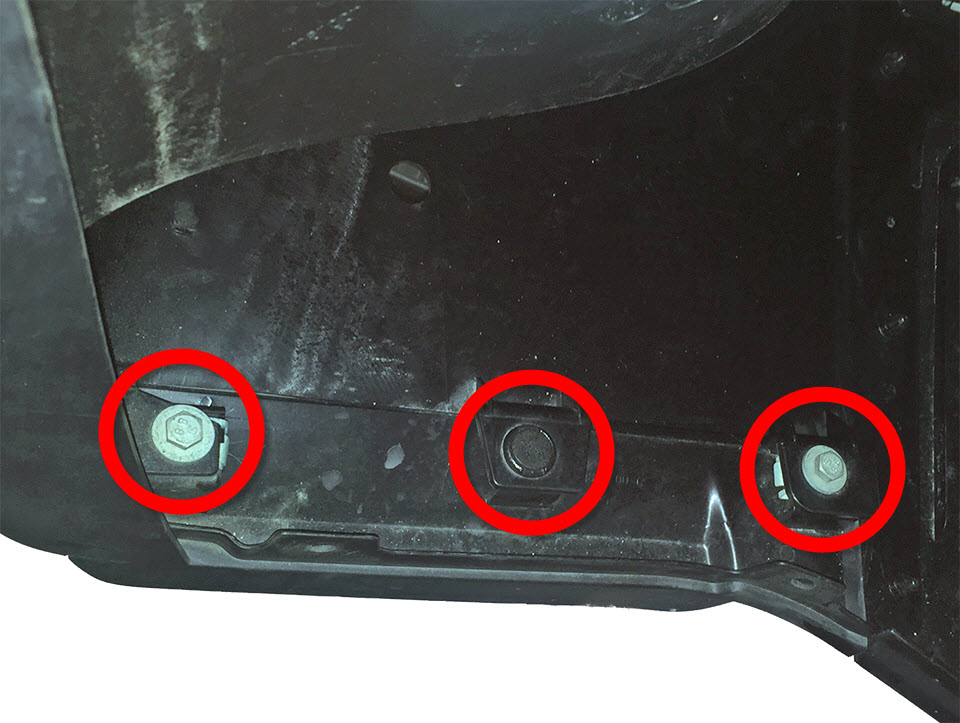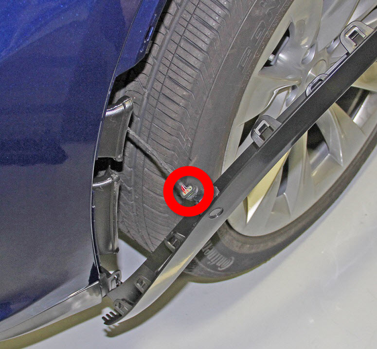 - Remove the bolts (x2) and push clip that attach the front of the fender garnish to the wheel fairing (torque 1.5 Nm).