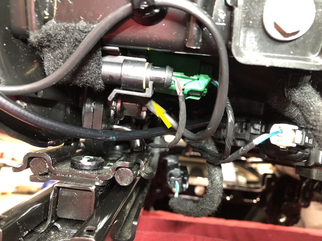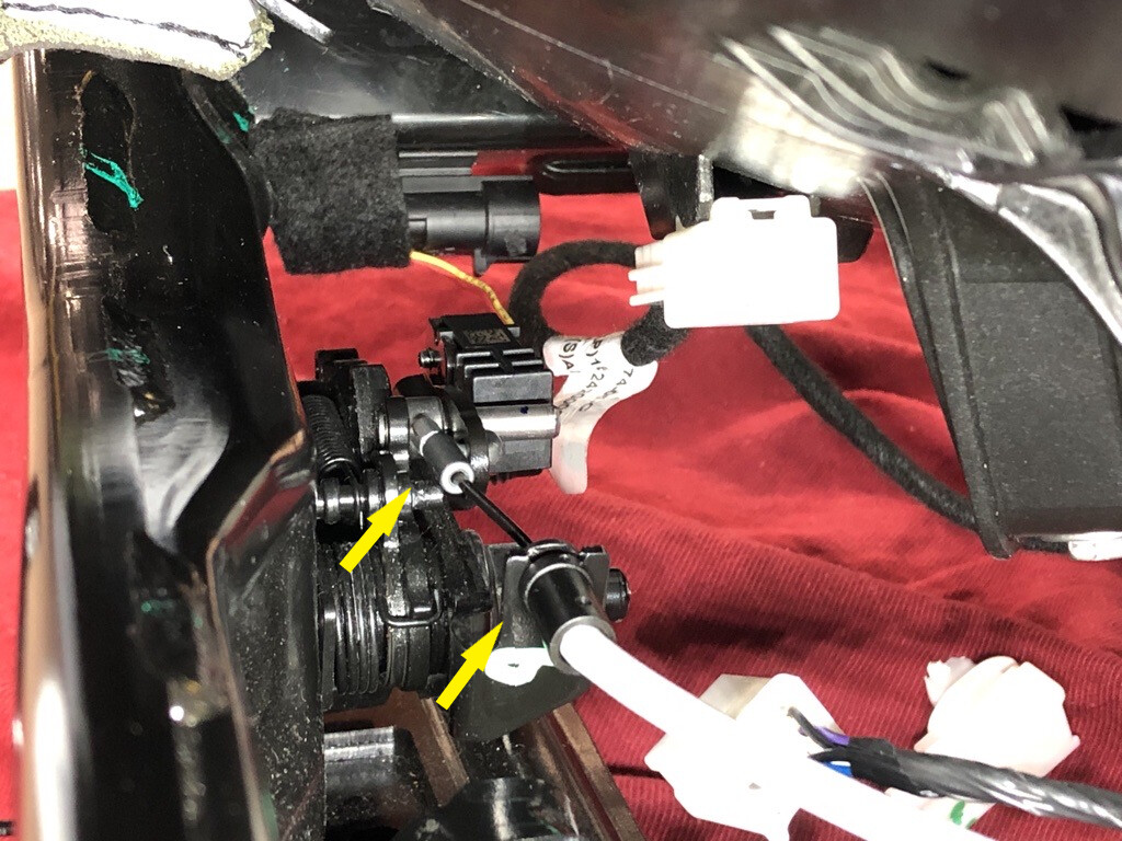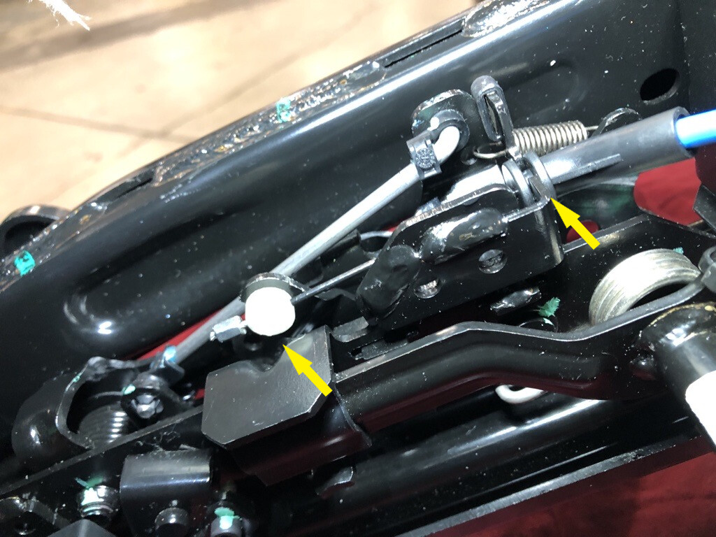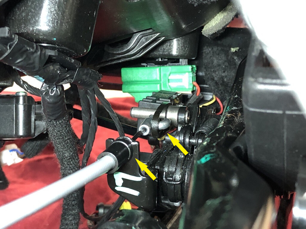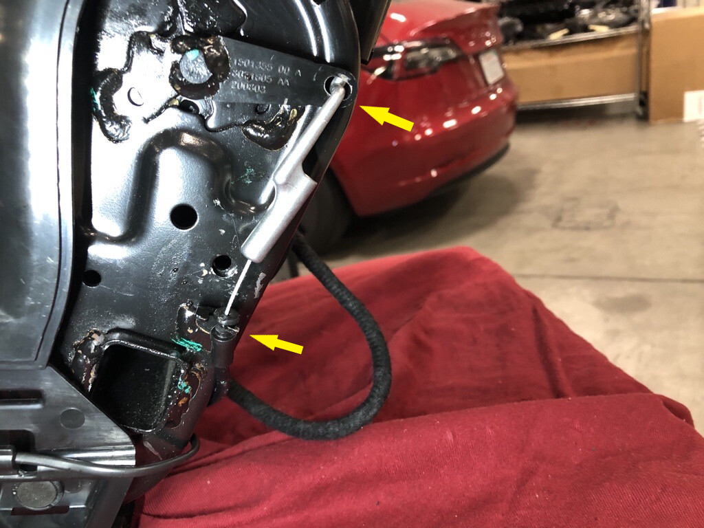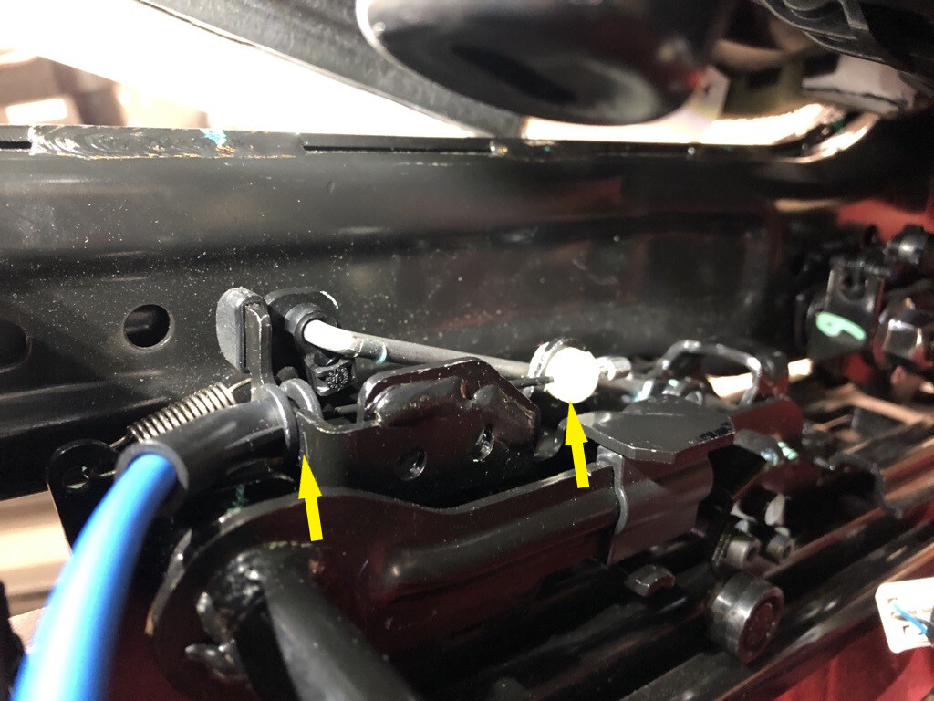 - Release the clips that attach the RH 2nd row seat recliner actuator cable to the recliner release arm.