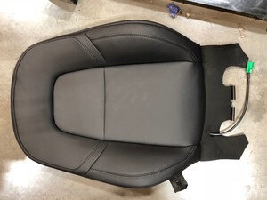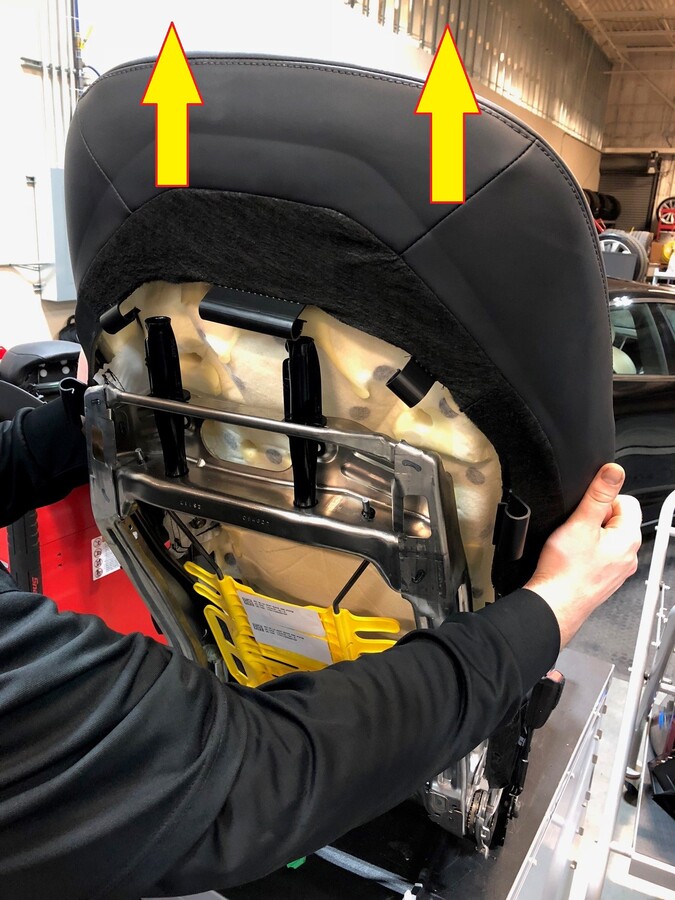 Start by sliding the foam trim straight onto the seat back frame. Ensure the posts for the headrests engage the seat back foam. Ensure the heater harness and lower trim that engages the frame are pushed through to the back side of the frame.