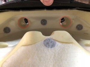 6. Remove the lower flap covering the inboard corner of the driver seat seat back frame.
