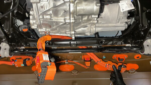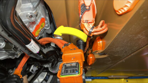 - Install the clip that attaches the rear drive unit inverter inlet hose to the HV battery to rear drive unit HV harness.