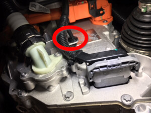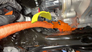 - Remove the clip that attaches the rear drive unit inverter inlet hose to the HV battery to rear drive unit HV harness.