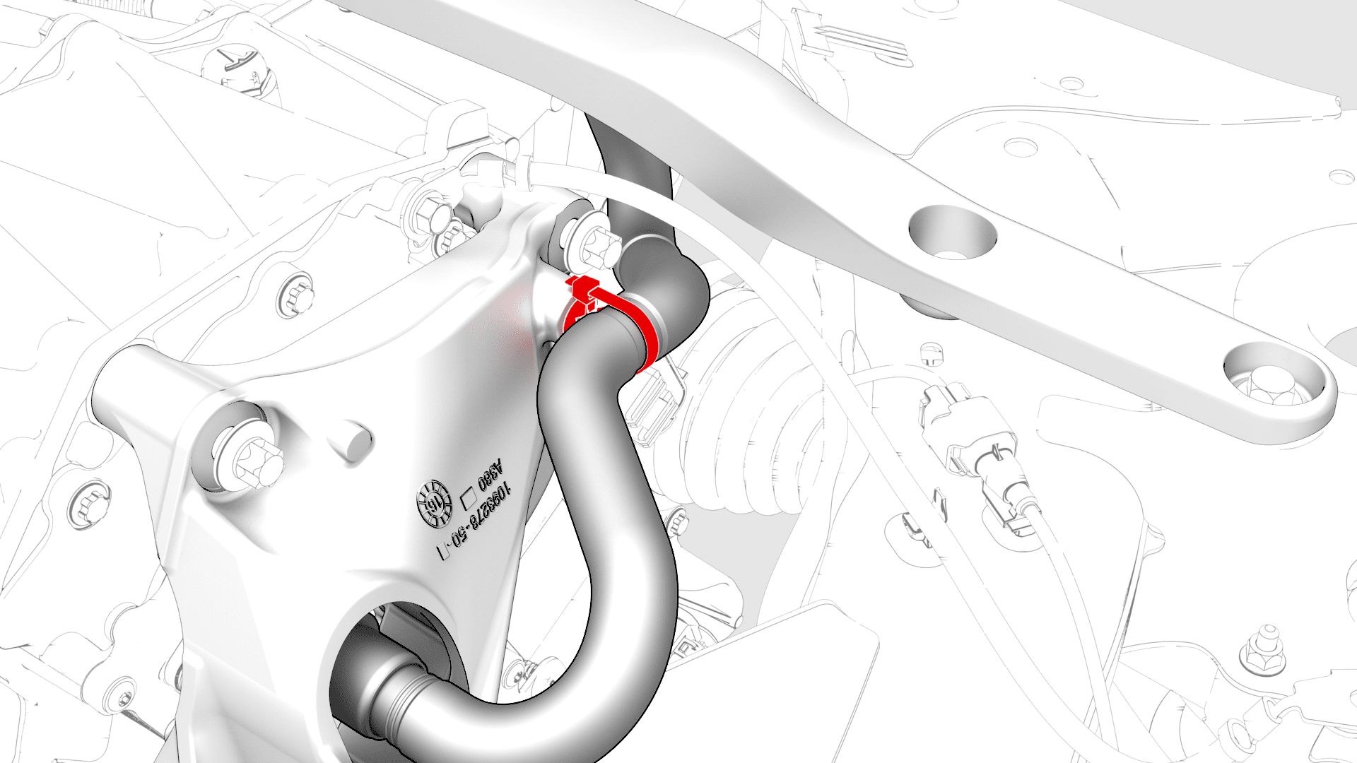 - Release the clip that attaches the coolant outlet hose to the LH mount.
