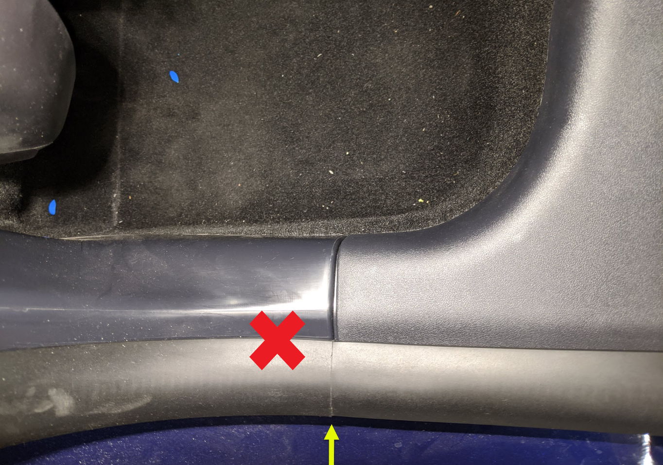 Figure 1. For vehicles built by Fremont and Austin, make sure the seam on the seal is even with the LH upper B-pillar.