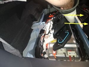 Remove upper bolts securing rear battery enclosure skid plate from HV battery