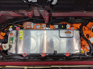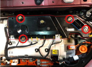 Torque bolts securing HV battery and rear skid plate to vehicle