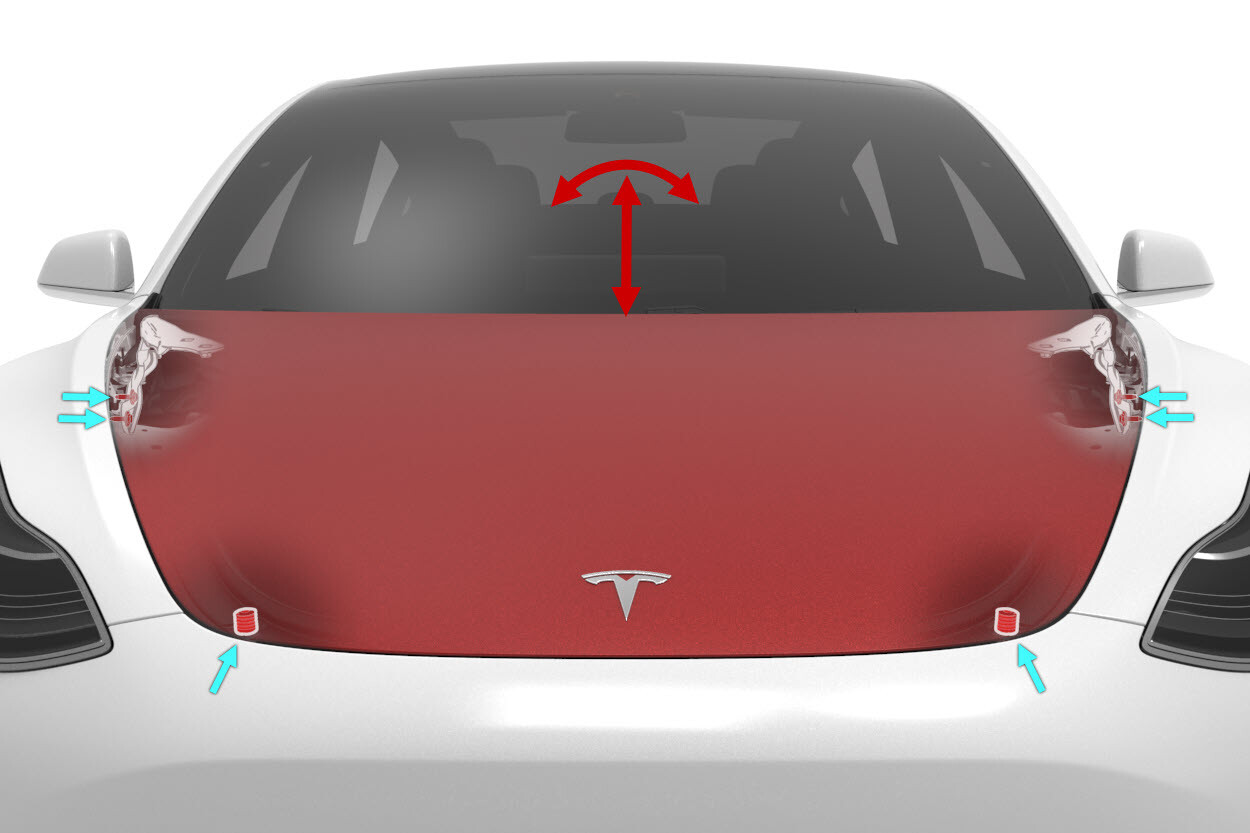 Tip: The rubber bumpstops at the front of the hood should be adjusted to set the height at the front slightly overflush from the fascia. Then, the latch can be adjusted to pull the hood down to flush and ensure the hood sits snugly in the closed position.NoteModel 3 images shown; Model Y similar.