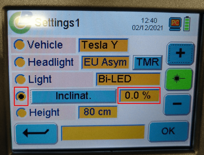 - On the headlight tester tool, select Vehicle, and then use the + or - buttons to set the vehicle type to Tesla Y.