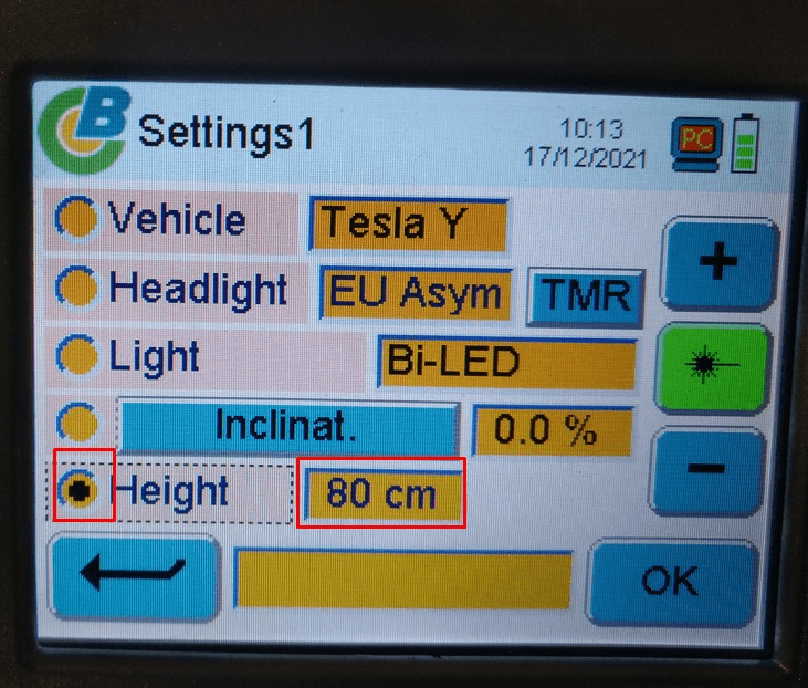 - On the headlight tester tool, select Height, and then use the + or - buttons to set the height to 81 cm.