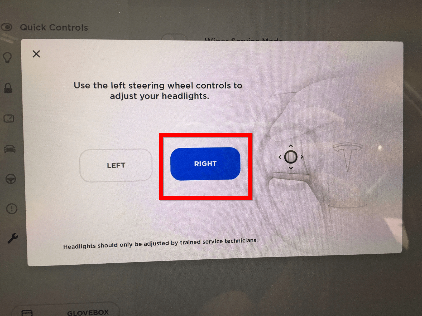 - If not already activated, enter headlight adjustment mode. On the vehicle touchscreen, touch: Controls > Service > Adjust Headlights.