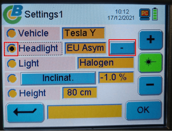 - On the headlight tester tool, select Headlight, use the + or - buttons to set the Headlight type to EU Asym, and then use the small - button next to the EU Asym field to select TMR.
