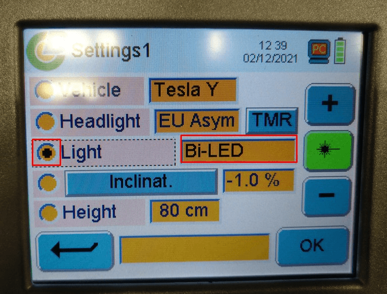 - On the headlight tester tool, select Light, and then use the + or - buttons to set the Light type to Bi-LED.