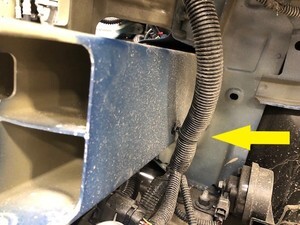 - Connect the electrical connector to the front fascia in the RH wheel well, and then engage the locking tab.