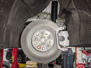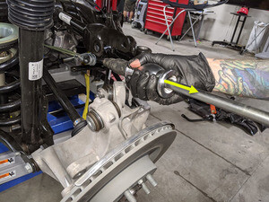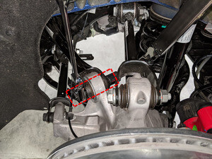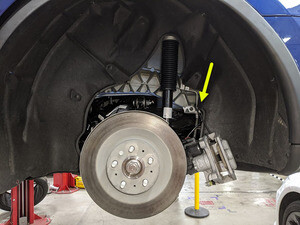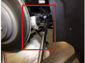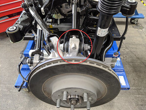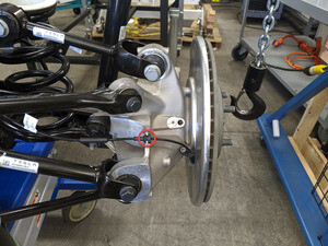 Remove LH rear brake caliper from LH rear knuckle and hang from body