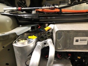 - Remove the retaining clip that attaches the A/C compressor logic harness to the A/C compressor HV harness bracket.