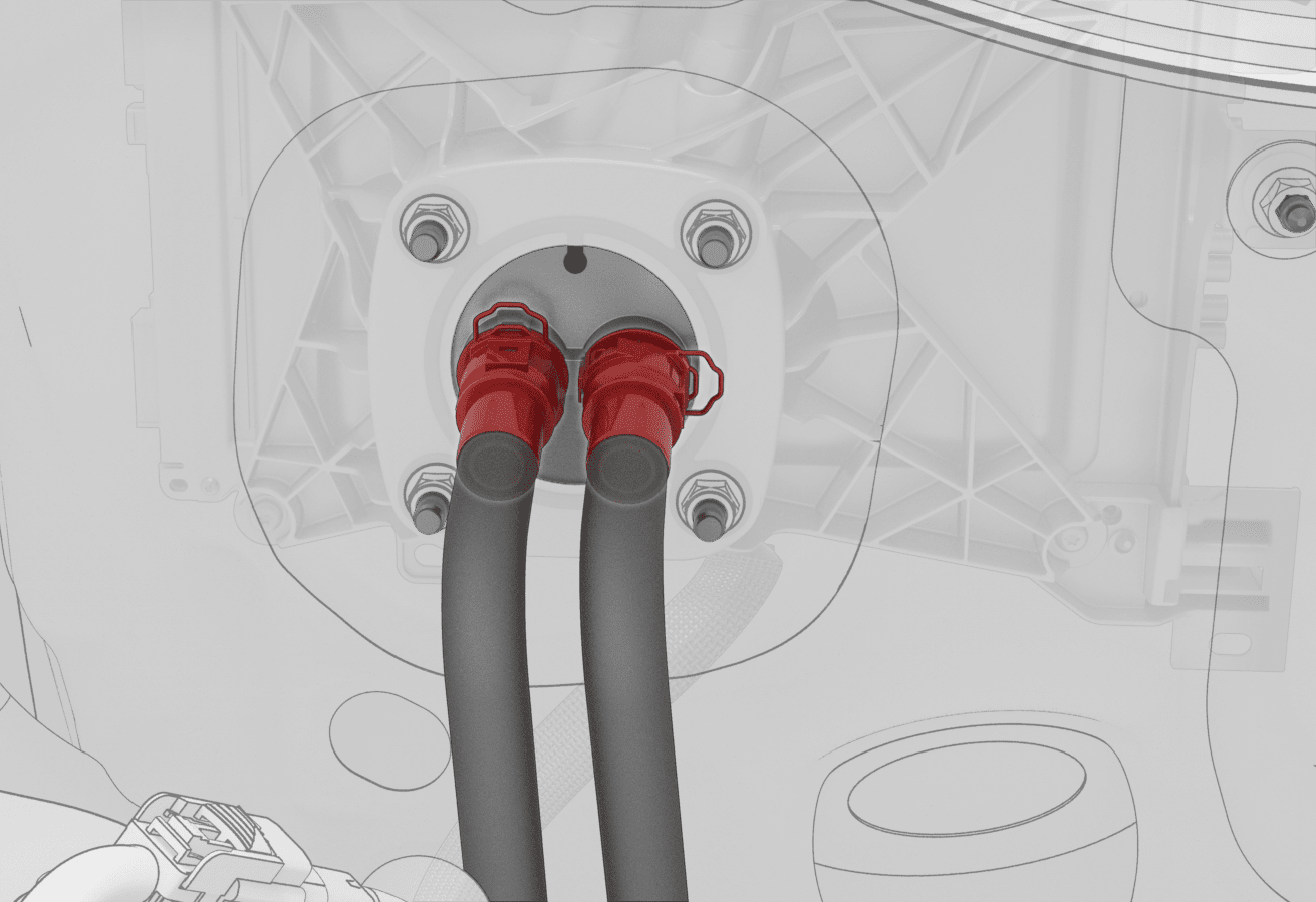 - Attach the hoses to the car computer coolant inlet and outlet, and then engage the spring clips (x2).