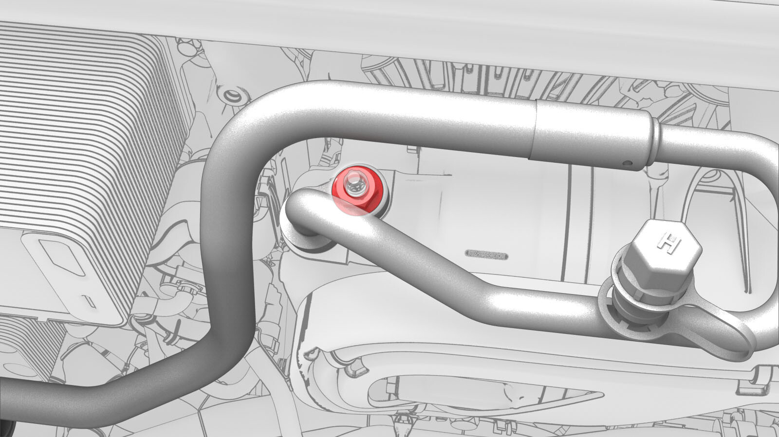 - Position the supermanifold to compressor A/C line onto the supermanifold, and then hand tighten the bolt that attaches the A/C line to the supermanifold.