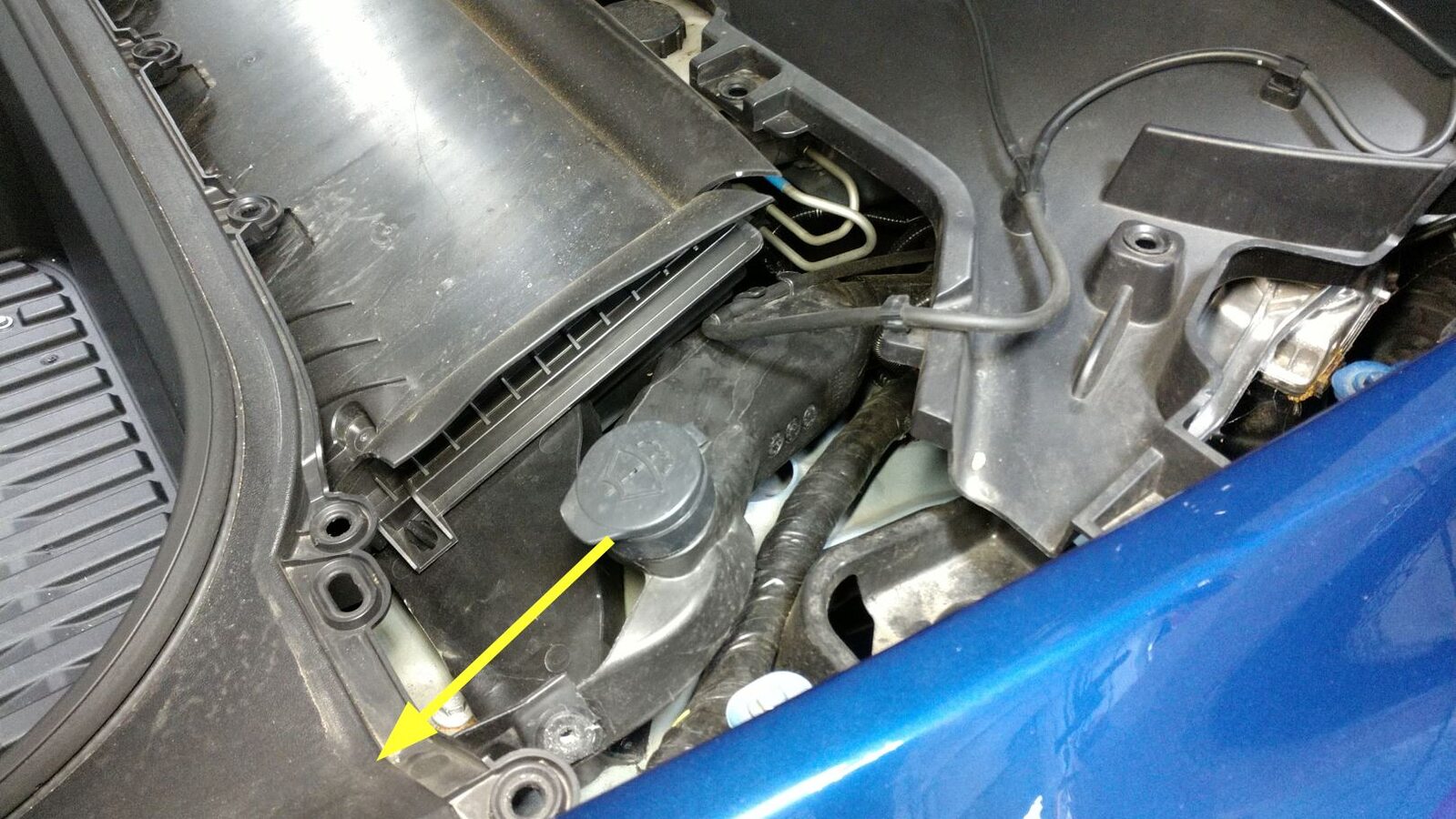 Note2x bolts, 10mm, 5 Nm, Pivot forward edge down past frunk assembly, Then carefully move rear edge past brake reservoir and into position, Gently press on RH side of filter to seat seal onto duct, Rework requires new bolts