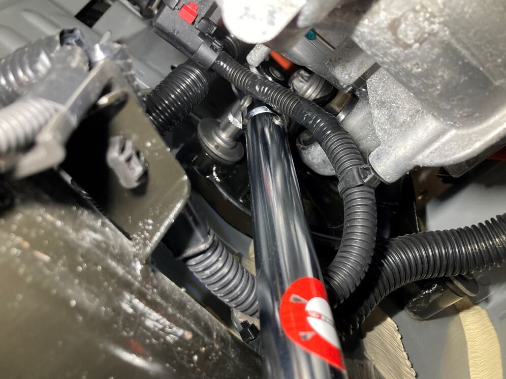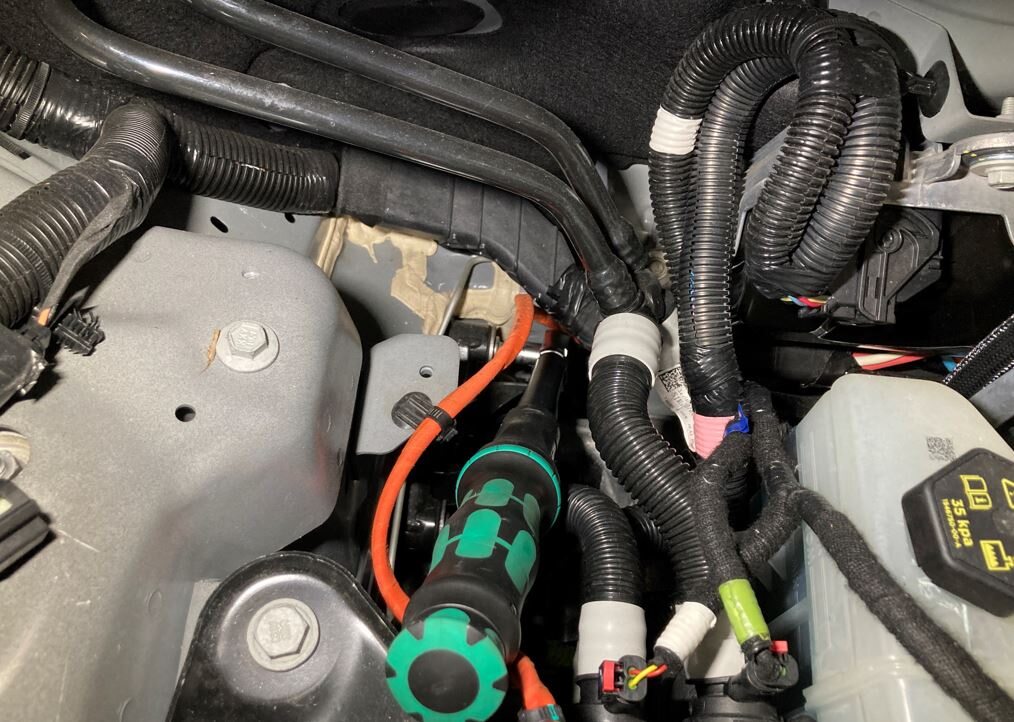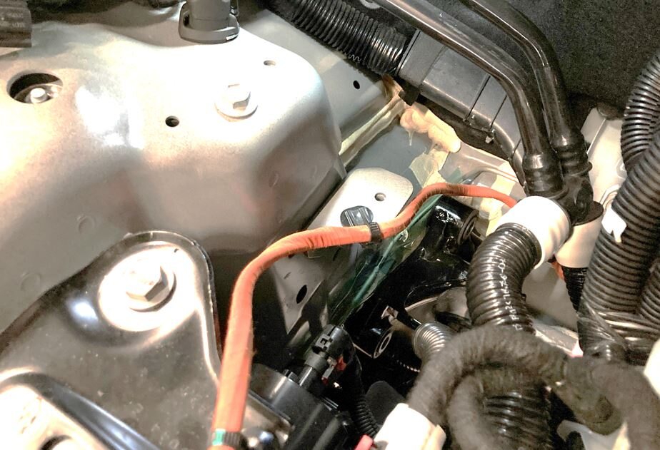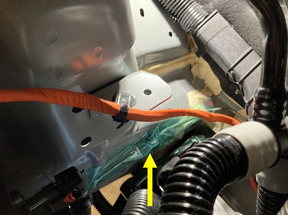 Secure AC HV compressor harness to RH shock tower