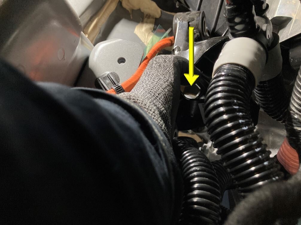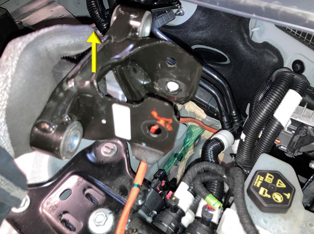 Release AC HV compressor harness from RH shock tower