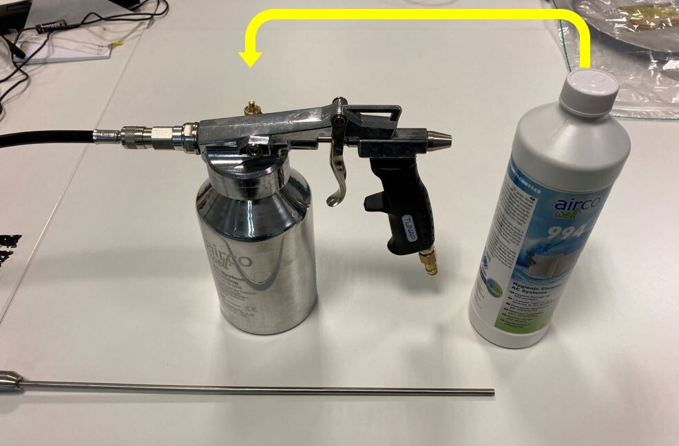 5. Pour 1 liter of Tunap 994 hygienic cleaner into the tank of the pressure cup spray gun, and then connect shop air to the spray gun.