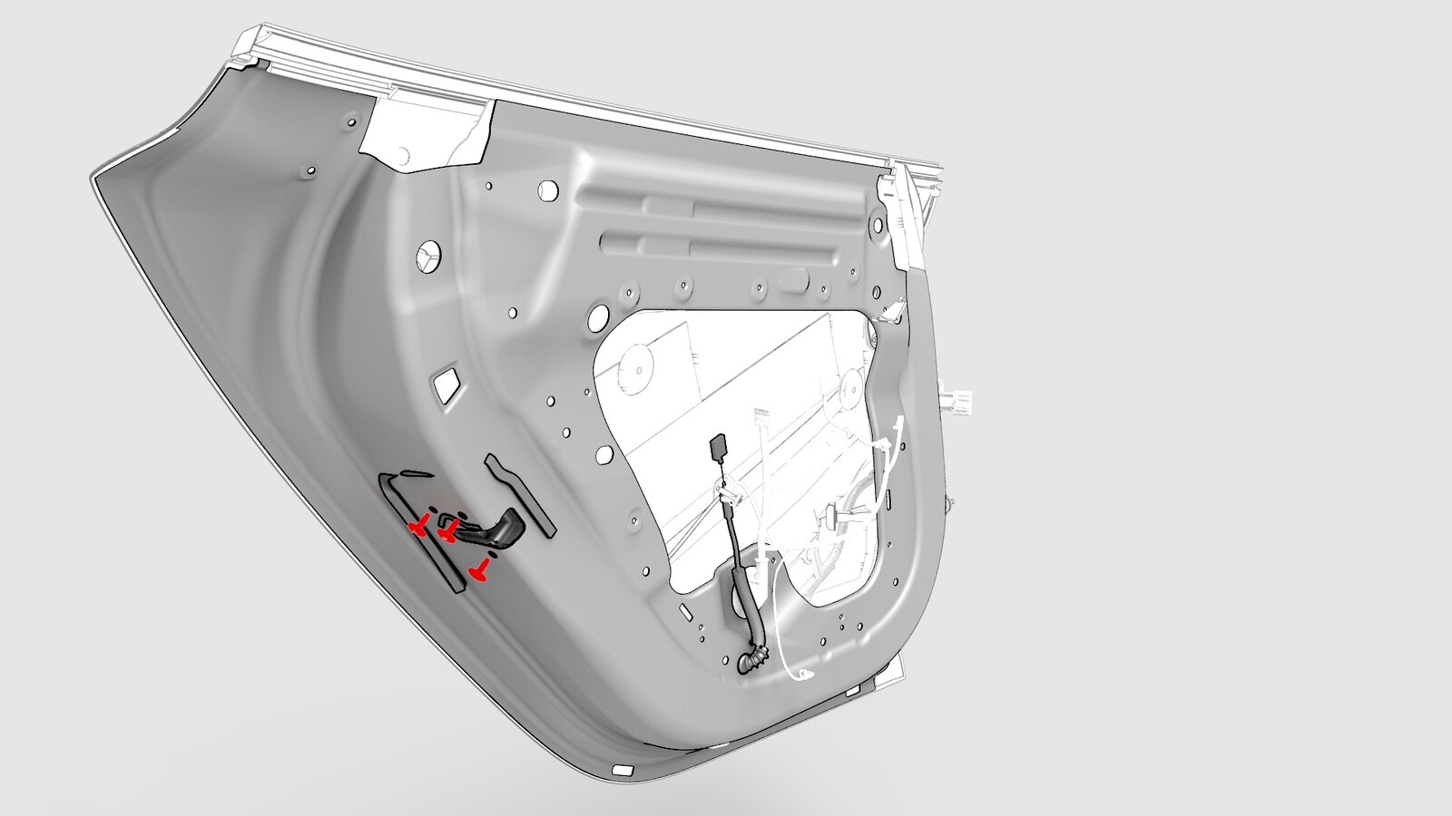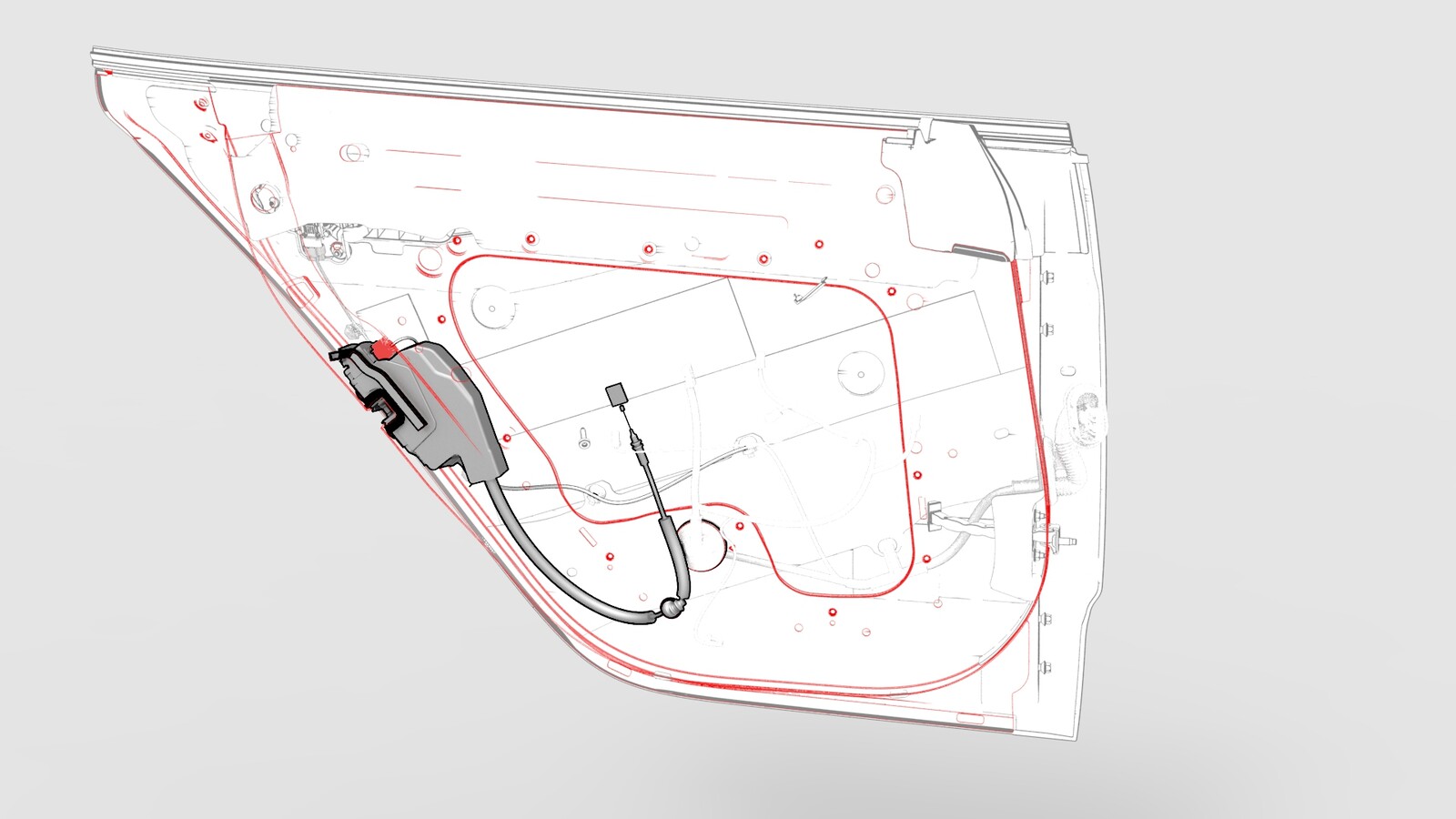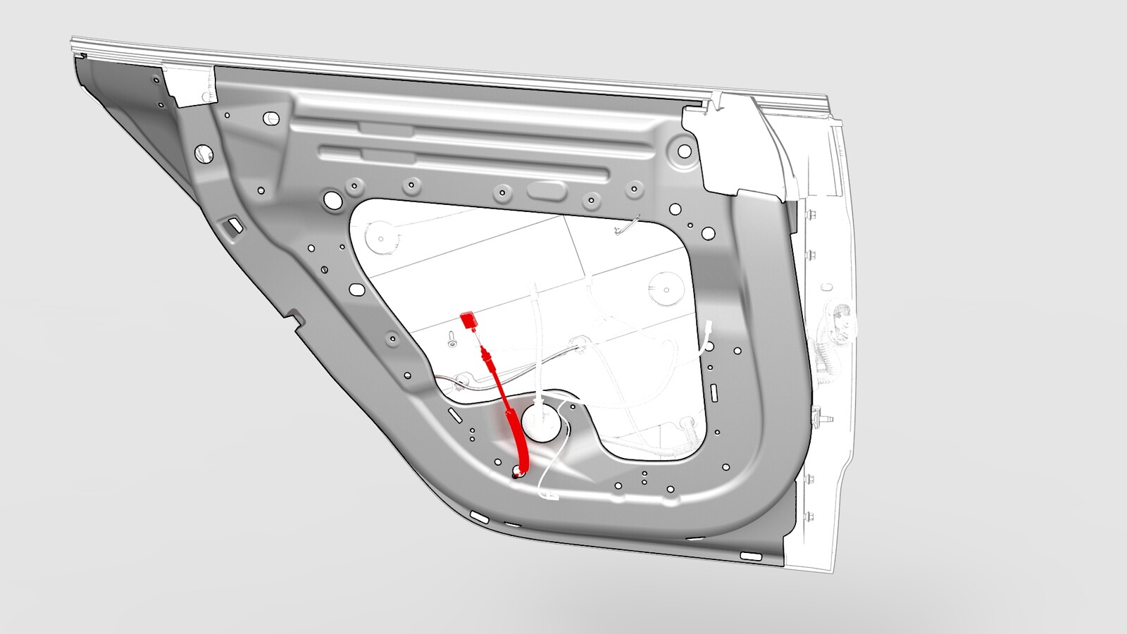 - Install the LH rear door latch into the LH rear door, while at the same time, move the latch cable out through the door, and then secure the latch cable grommet in the door.