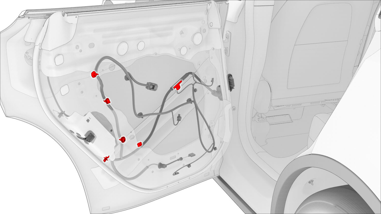 - Fasten the clips (x6) that attach the LH rear door latch harness to the door.