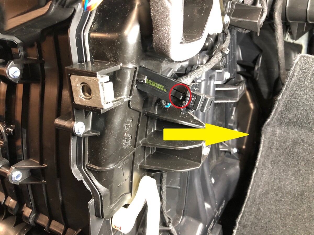 - Install the RH upper duct thermistor into the HVAC assembly.