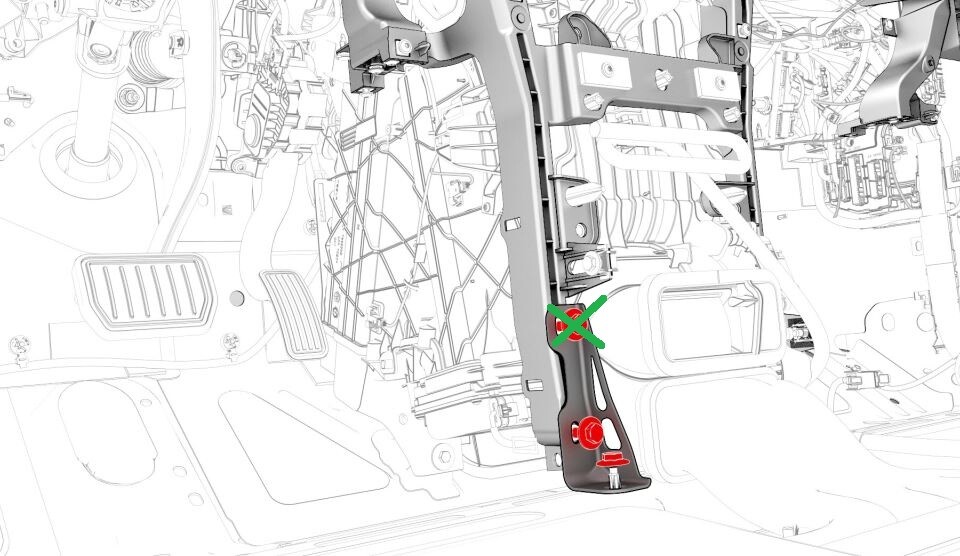 | Bolt that attaches the cross car beam to the HVAC assembly on the upper LH side of the HVAC assembly |