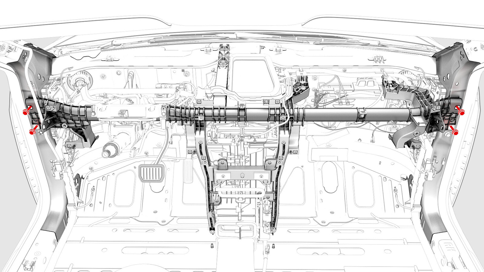 - Loosely install the bolt that attaches the cross car beam to the HVAC assembly on the upper LH side of the HVAC assembly.