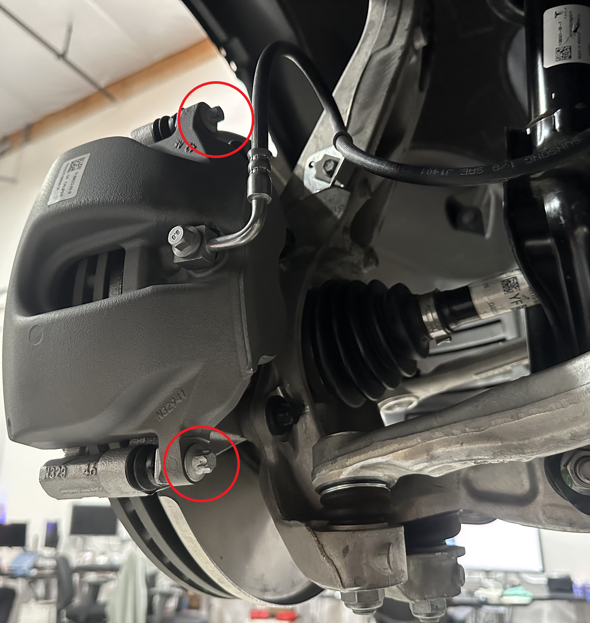 - Use a brake caliper S-hook to hang the LH front caliper on the body.