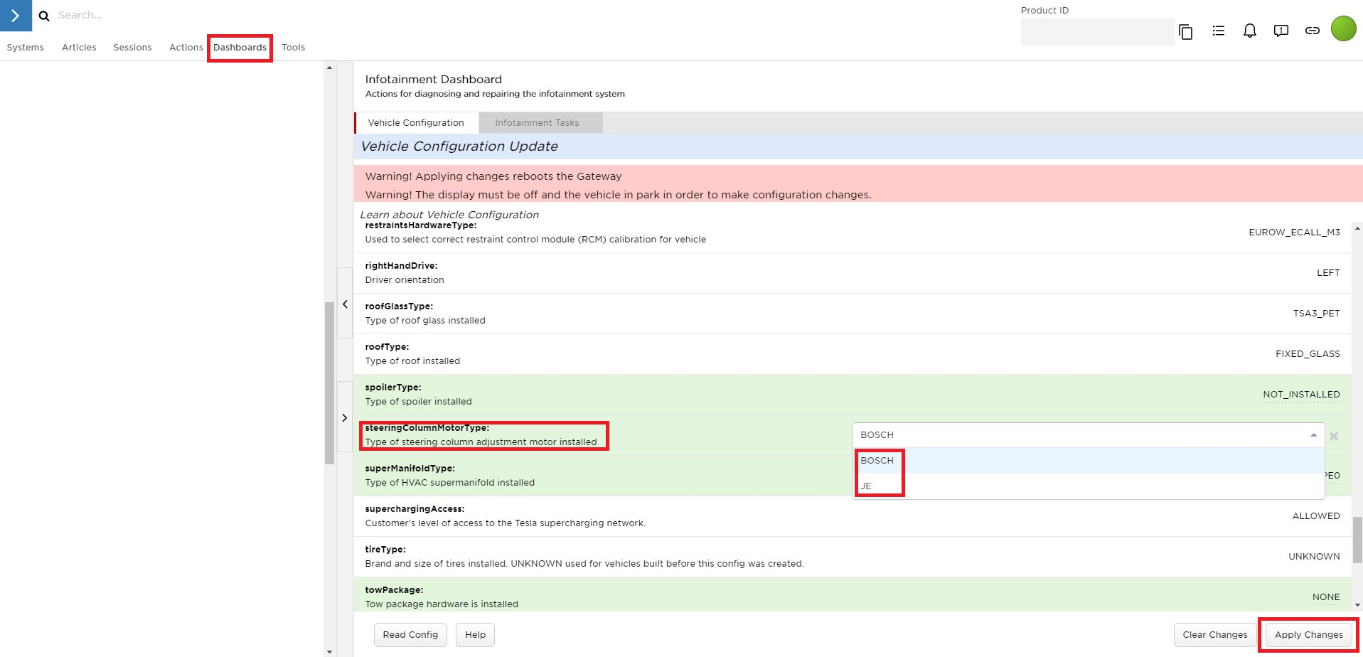 - In Toolbox, click , click the Vehicle Configuration tab, scroll to steeringColumnMotorType, from the drop down menu to the right, select "BOSCH" or "JE" according to the above table, and then click Apply Changes.