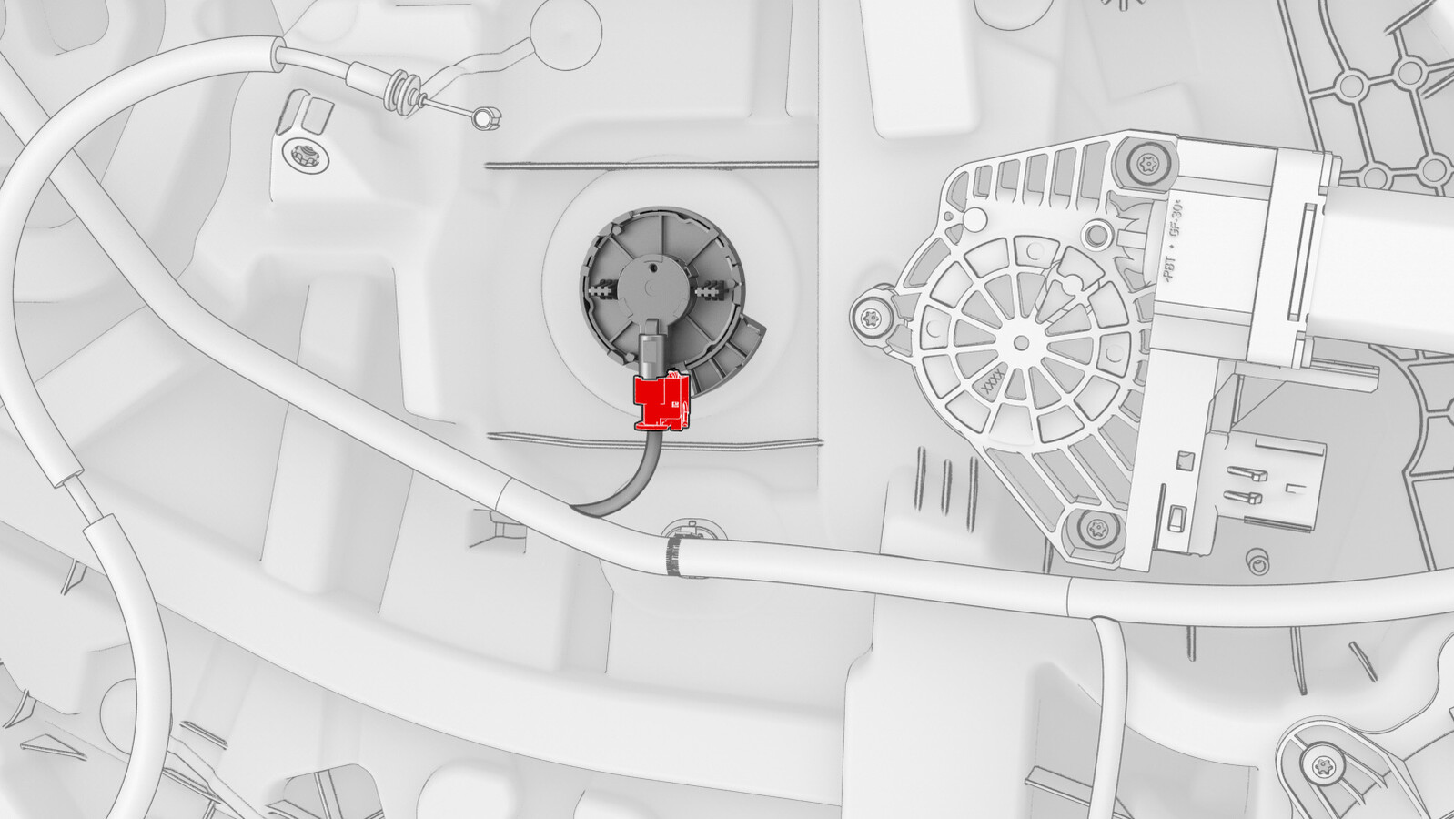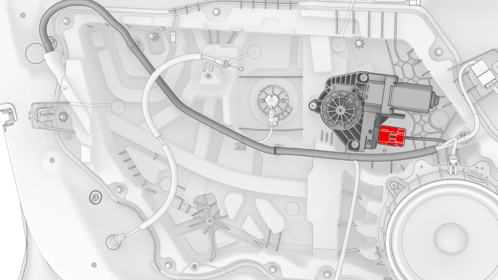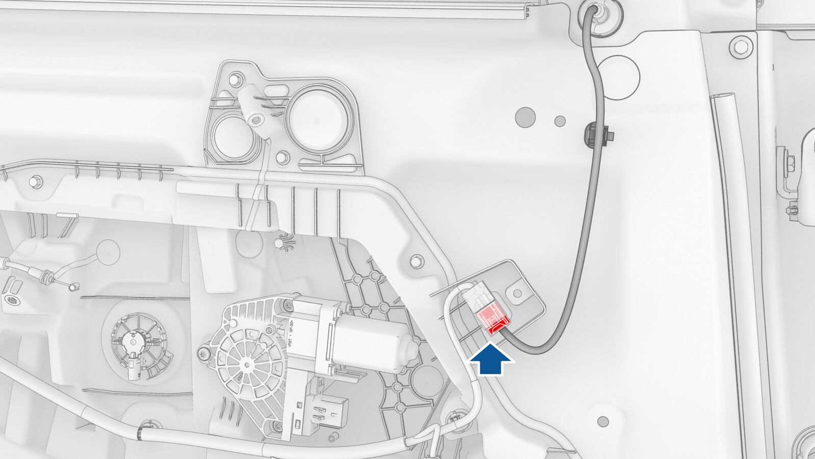 - Release the connector lock, and then disconnect the electrical wiring harness from the LH front door window motor connector.