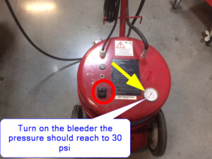 NoteConnect power supply to bleeder and turn on the power, Set pressure to 30 psi, Attach brake bleed reservoir to brake bleed adapter