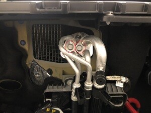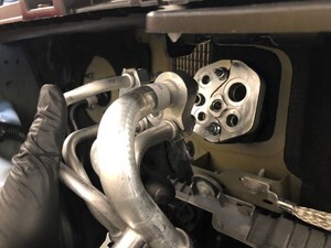 - Remove the bolts (x2) that attach the A/C manifold to HVAC line assembly to the HVAC assembly.