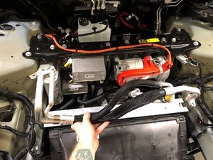 - Install the retaining clips that secure the AC compressor HV harness to the shock tower brace.