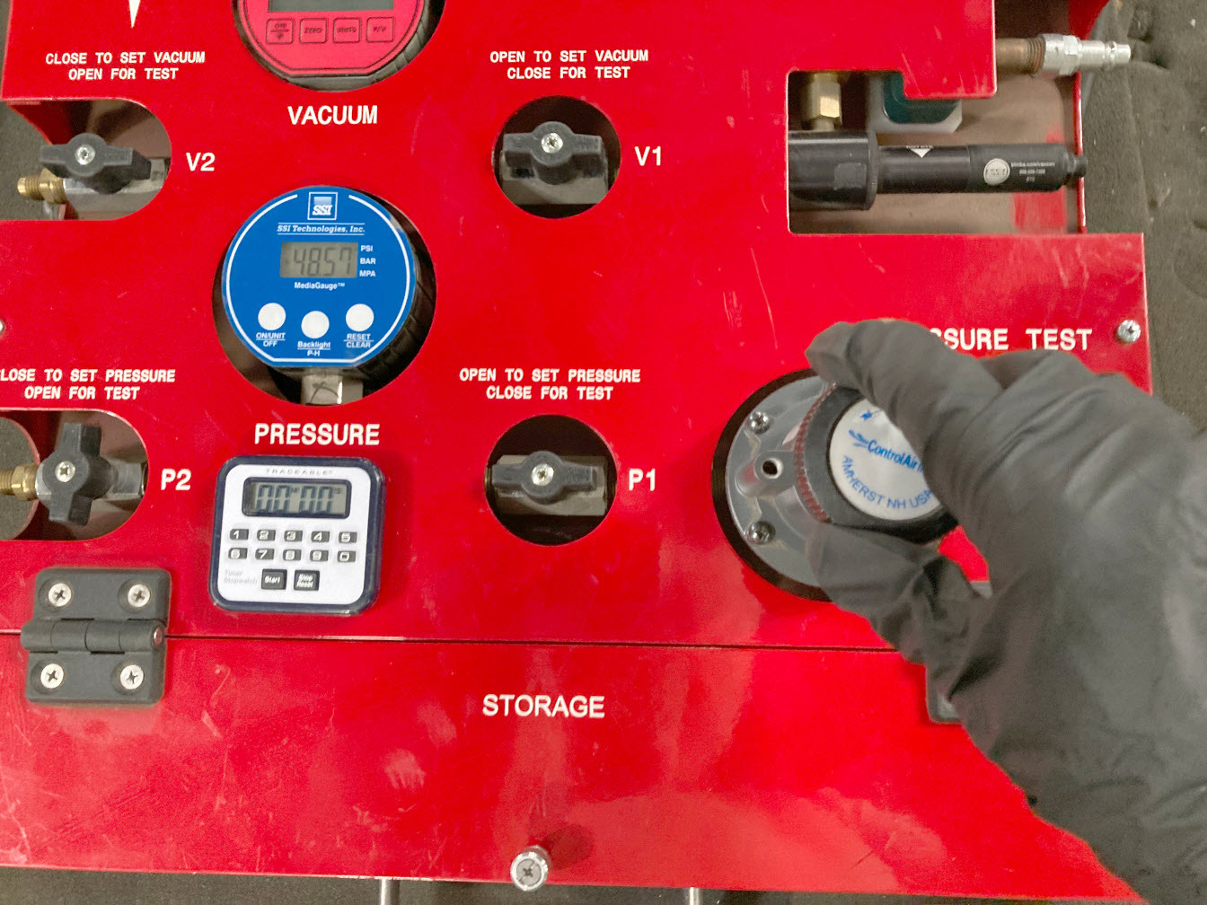48. Turn valve P1 (inlet) counter-clockwise to open, and allow the air to bleed of f.
