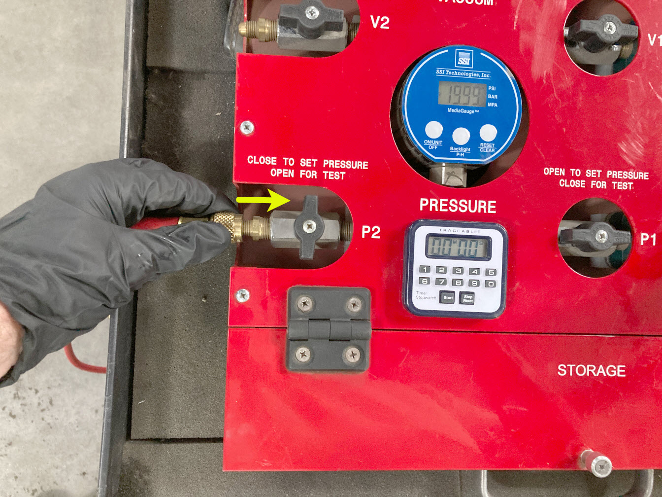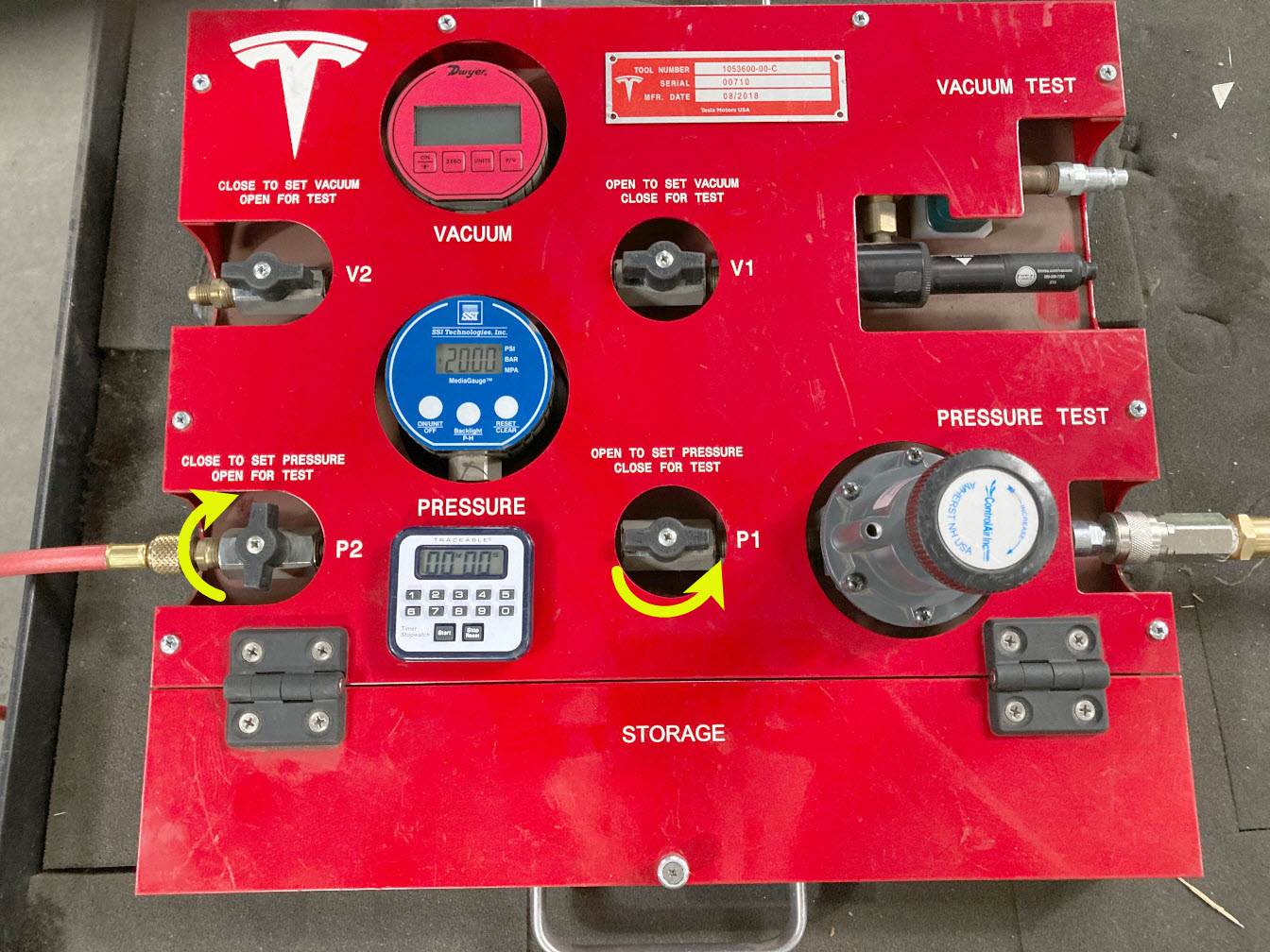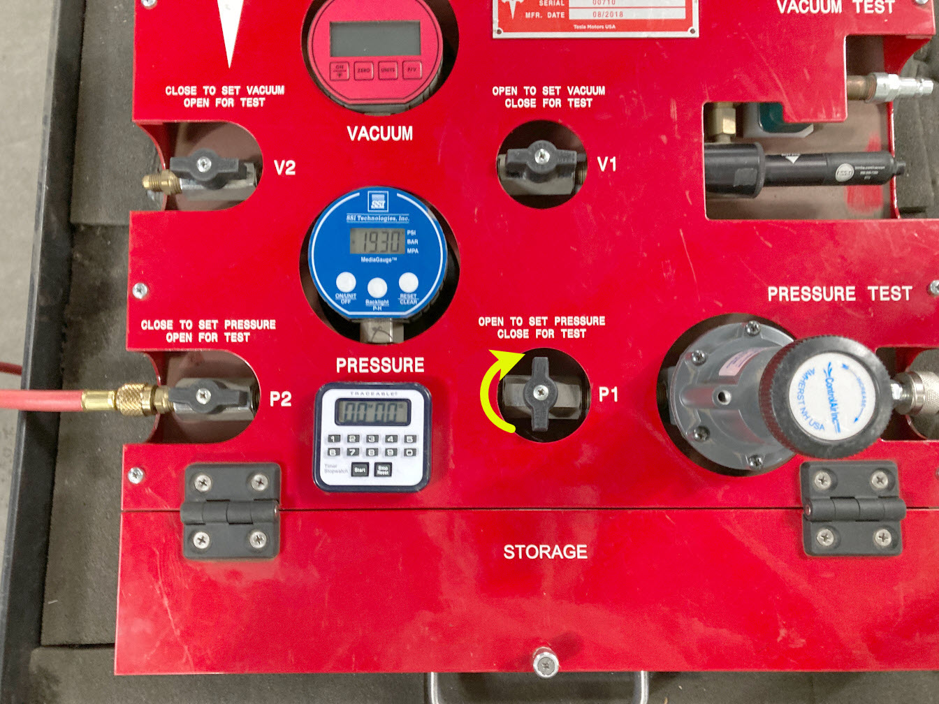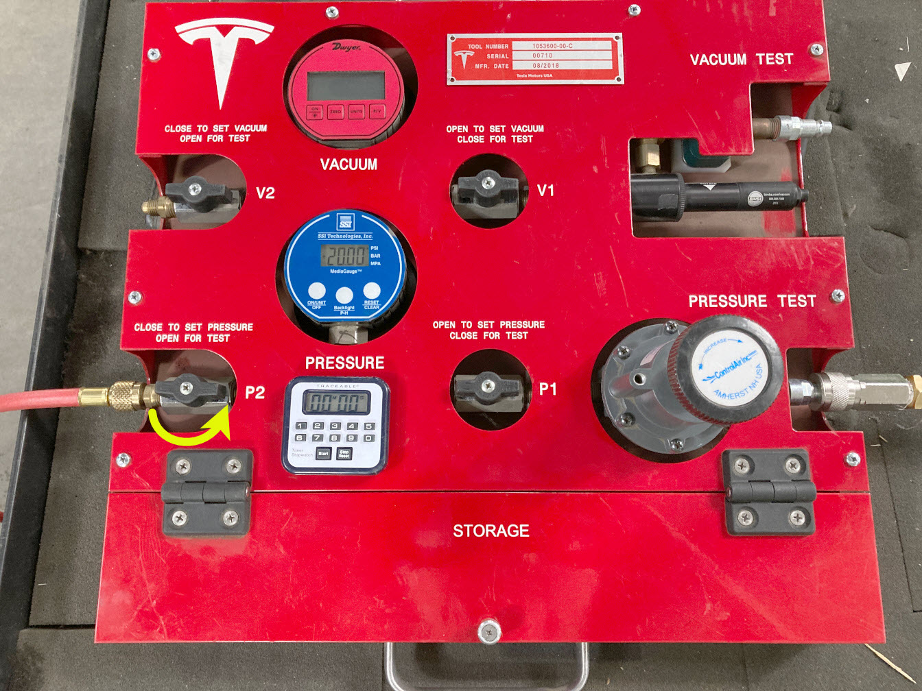 8. On the drive unit pressure test fixture, turn both valve P2 (outlet) and valve P1 (inlet) clockwise to close.