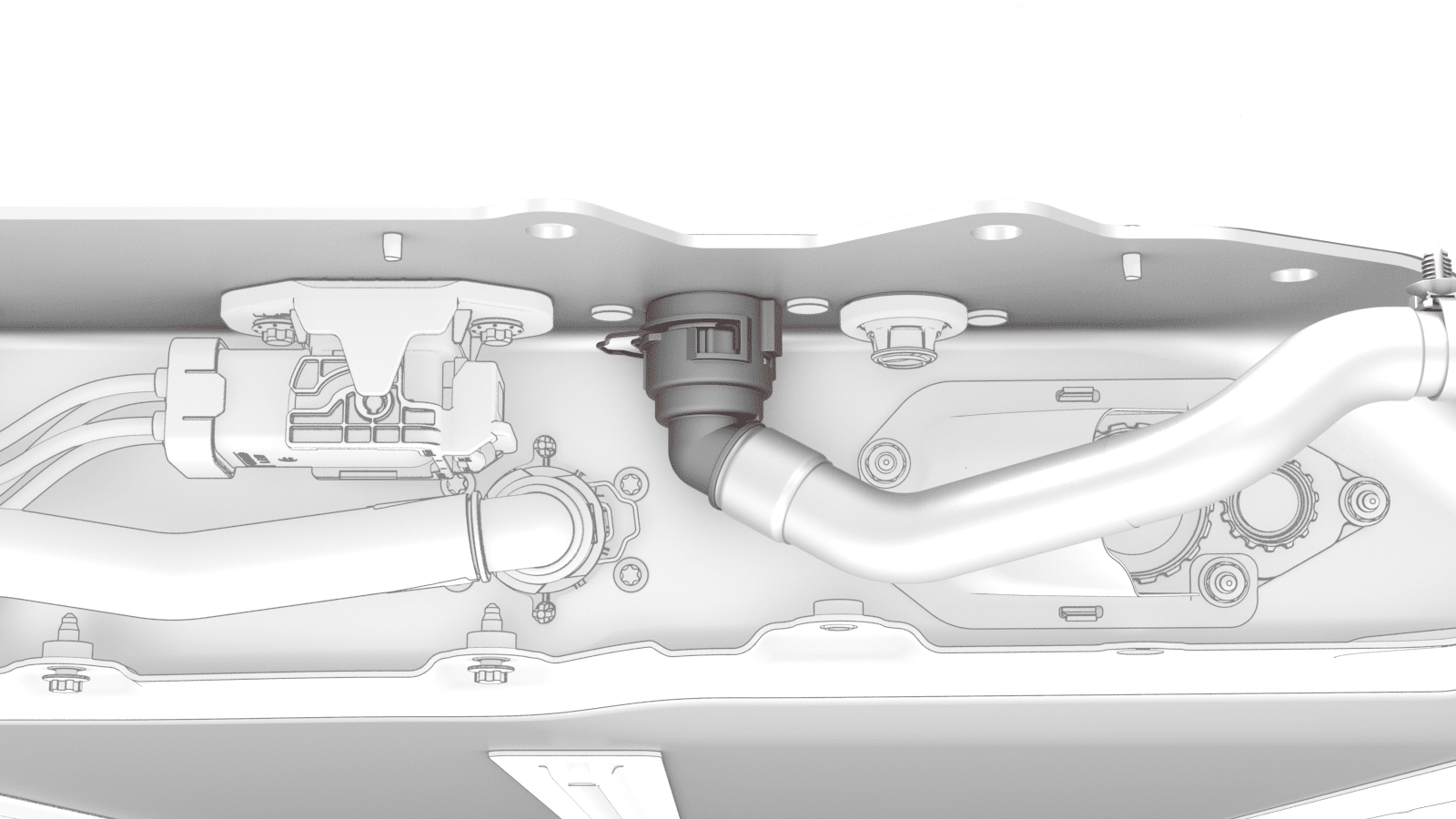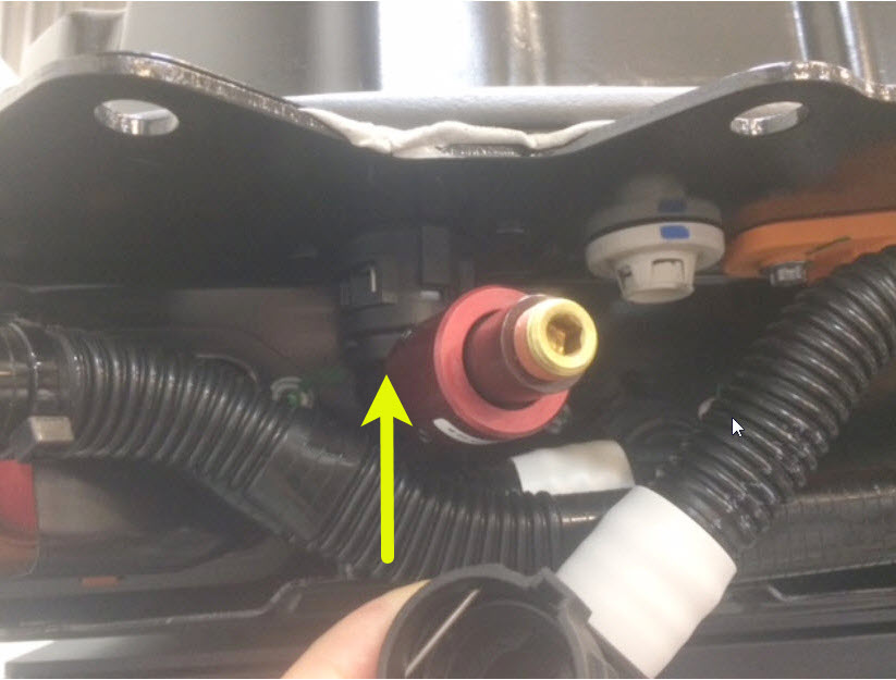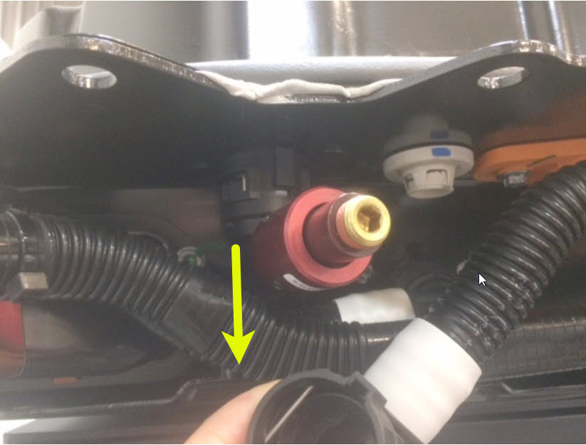56. Remove the plug from the rear drive unit inverter inlet hose, connect the hose to the male fitting on the LH underside of the ancillary bay, fasten the clip, and then perform a Push-Pull-Push test of the fitting.