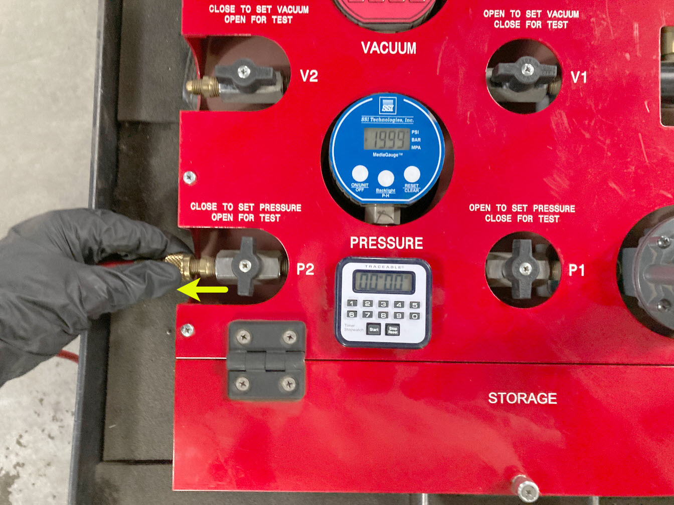 21. Slowly turn valve P2 (outlet) counter-clockwise to open and start the timer.