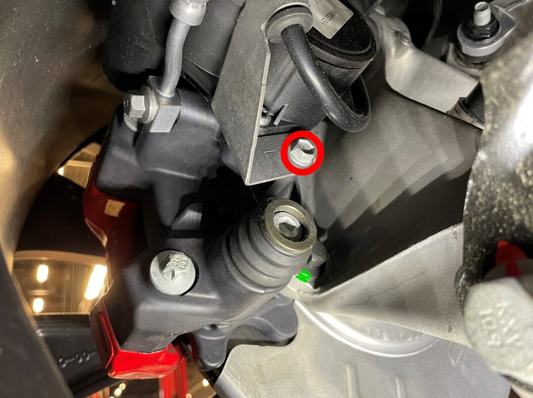 - Remove the bolt that attaches the LH rear brake caliper harness bracket.