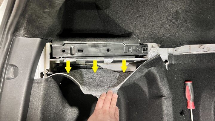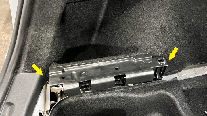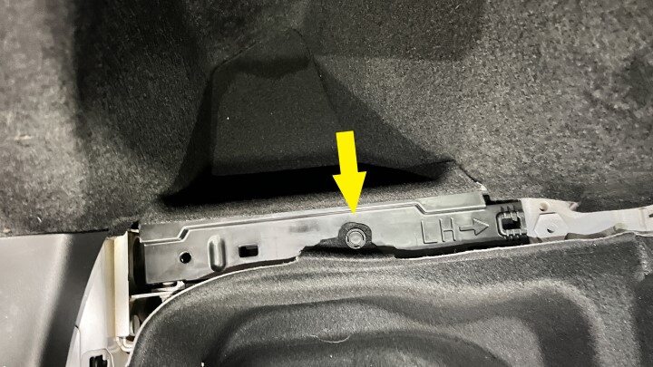 - Remove the push clip that attaches the trunk tub liner LH rucket bracket, and then partially release the liner for access.