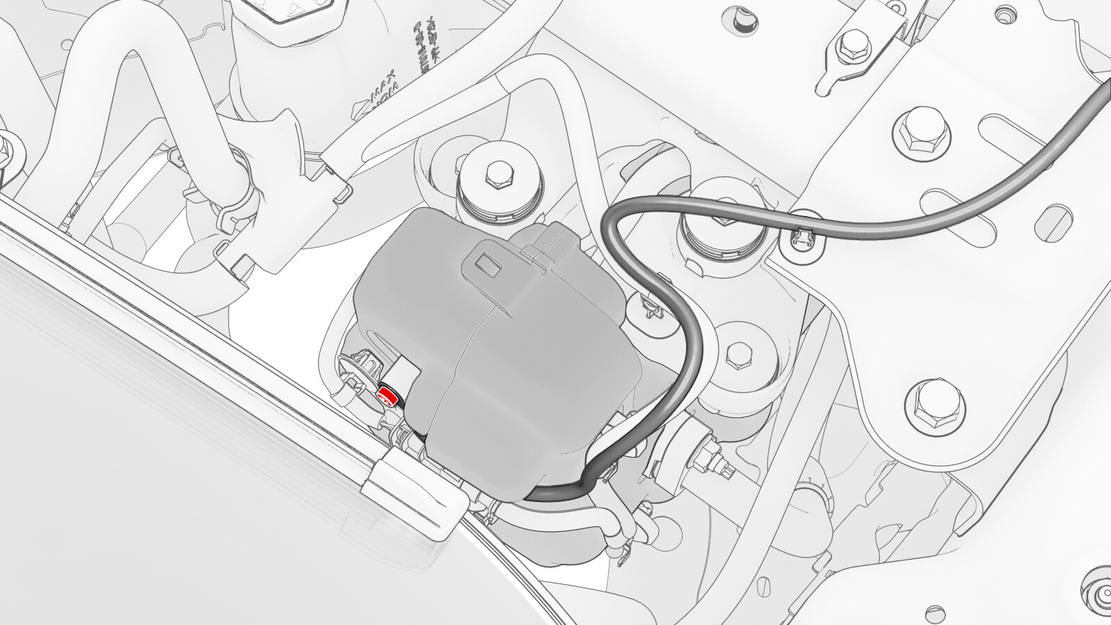 - Remove the bolt that attaches the suction/liquid line bracket to the shock tower brace, and then separate the bracket from the brace.