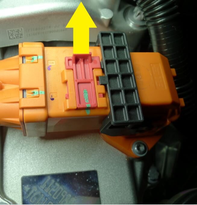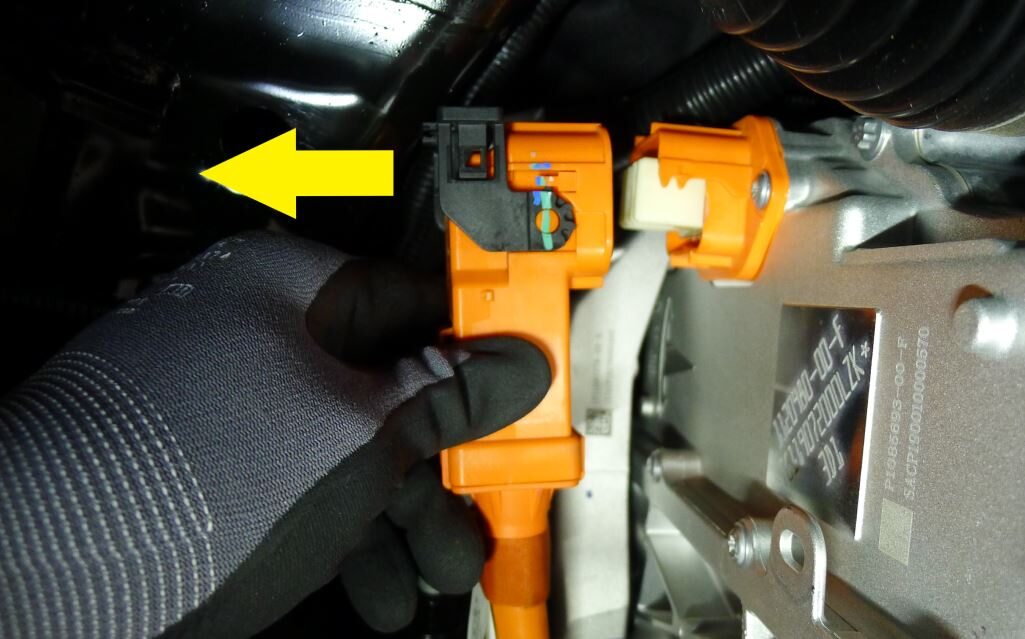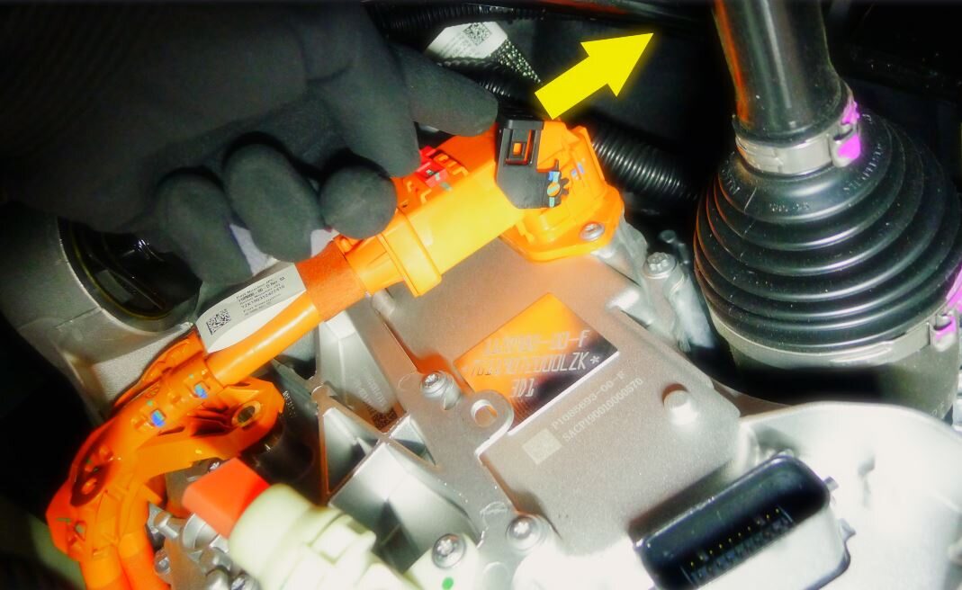 - Slide the red locking tab, raise the black handle, disconnect the rear drive unit HV harness from the rear drive unit inverter HV header,and then set the HV harness aside.