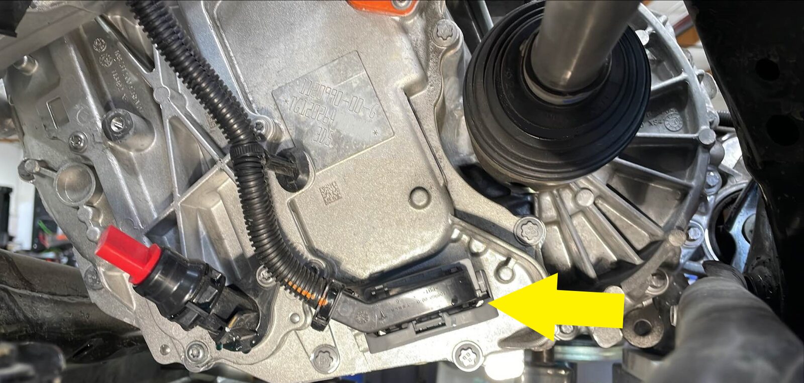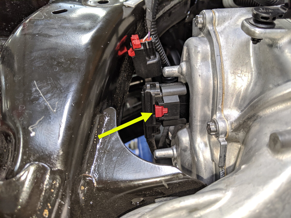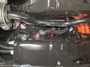 - Pull the red tab to release, and then pull the red tab again to disconnect the rear subframe harness from the resolver connector.