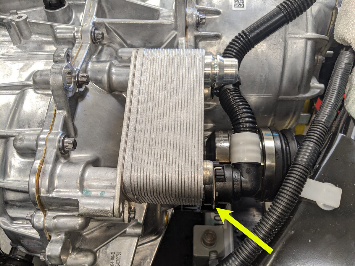 - Release the clip, disconnect the rear drive unit heat exchanger outlet hose from the rear drive unit heat exchanger, and allow to drain.