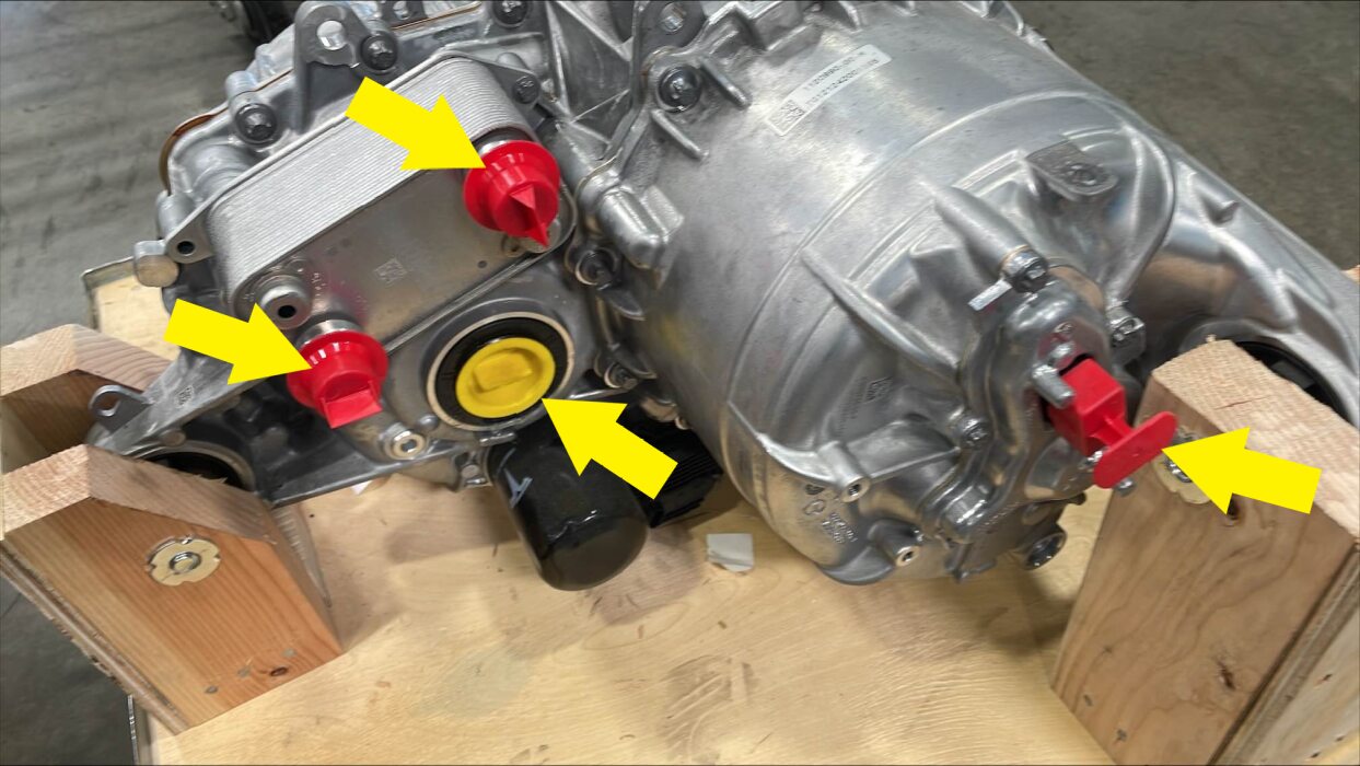 - Remove the plugs from the fittings, immediately connect the rear drive unit inverter inlet hose to the HV battery, fasten the clip, and then perform a Push-Pull-Push check of the fitting.