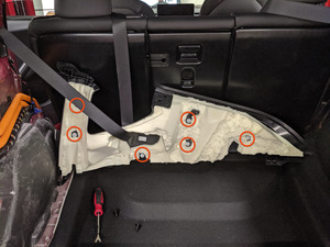 Note5x clips, Rear edge is mated with groove in trunk side trim, Install rear edge of RH rear sill trim into trunk side trim and work your way forward securing clips