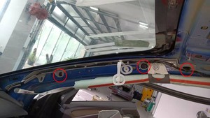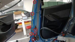 Note1x push clip, 5x clips, Guide front clip stanchions around LH C-pillar